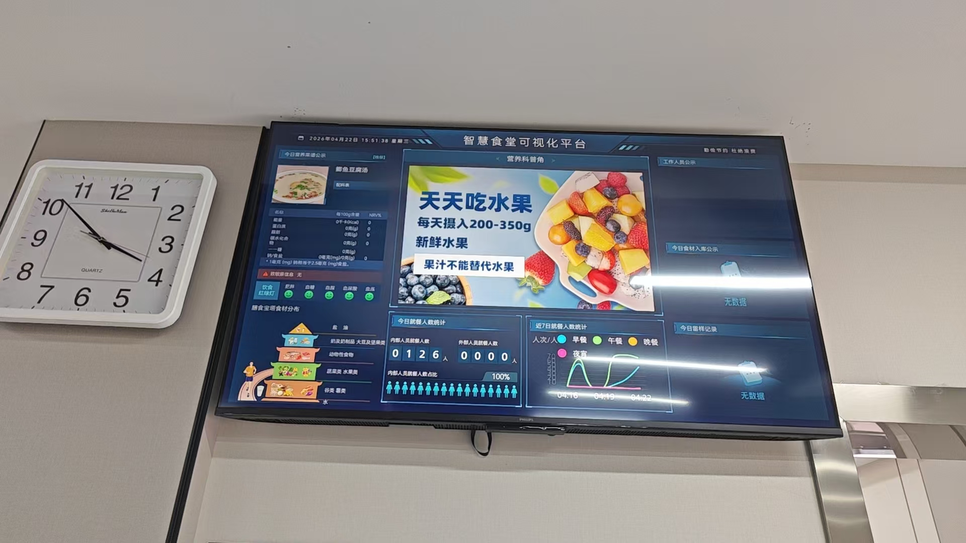2026年4月22日,我单位智慧食堂建设项目顺利完成招标采购及全部施工部署。项目严格按照招标要求、建设标准稳步推进,完成智能点餐、线上充值、智能结算、食材溯源、明厨亮灶、违规抓拍等全套智慧化系统搭建与设备安装调试。